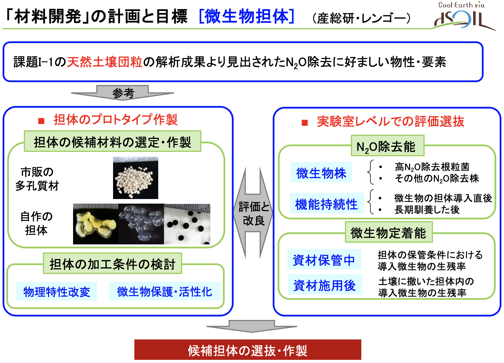 N₂O除去微生物担体により土壌N₂O除去効果をマイクロコズム実験で評価し、資材候補を2種以上決定し、ラボスケールで肥料由来のN₂O削減率30%以上を達成する。