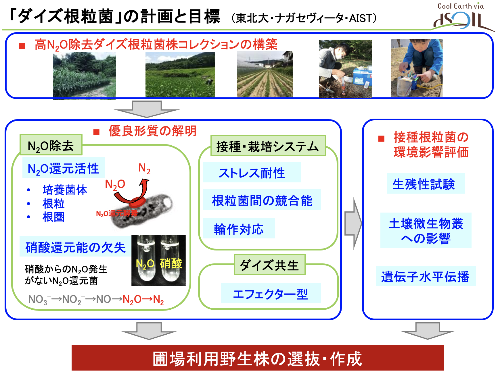 N₂O除去根粒菌の能力を最大化するため、植物・根粒菌双方の共生関連因子の同定と機能解明に基づく「共生最適化」により、 N₂O除去根粒菌の優占感染による40%以上のN₂O削減を実現する。生育促進菌とN₂O除去根粒菌の共接種により、ダイズ共生能を向上させることで、N₂O削減技術の社会実装を加速化する。